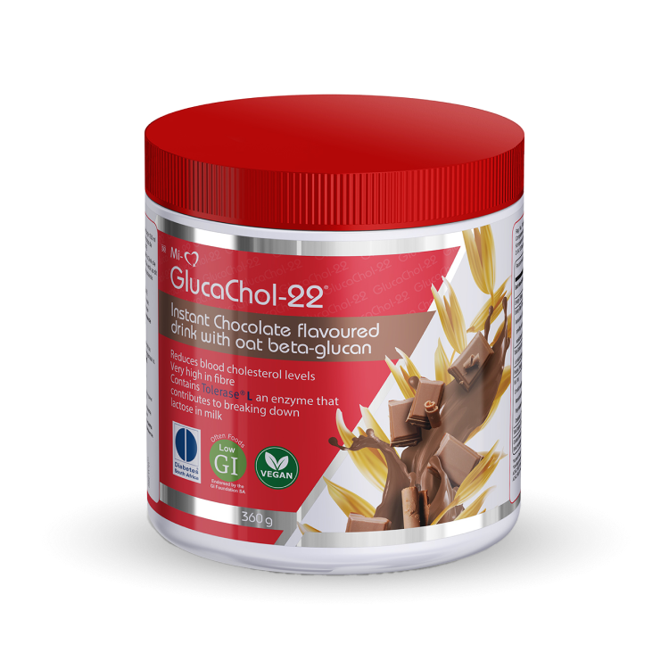 GlucaChol-22® Instant Chocolate Flavoured Drink is a 100% concentrated oat bran powder with a chocolate flavour that contains a high concentration (22%) of oat beta-glucan (soluble dietary fibre) – the active ingredient to lower cholesterol.