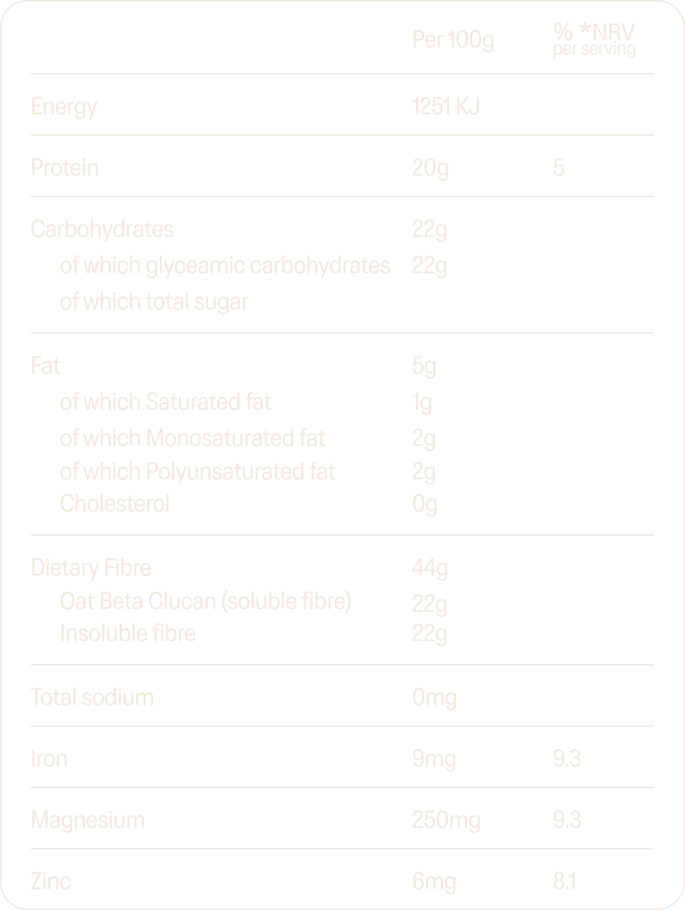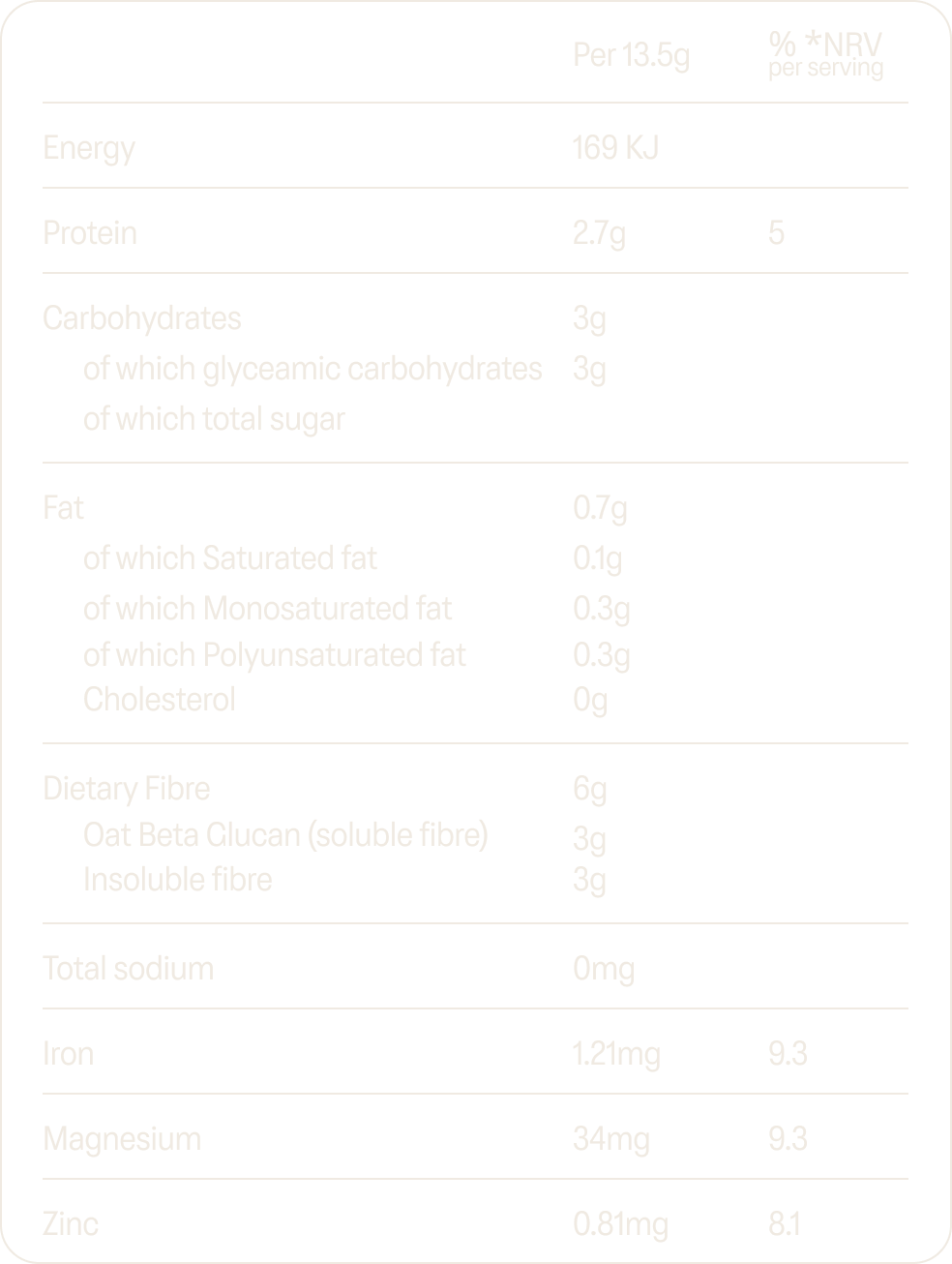 Ingredients: Avena sativa L. (Oat bran) (gluten) providing oat beta-glucan (soluble fibre).