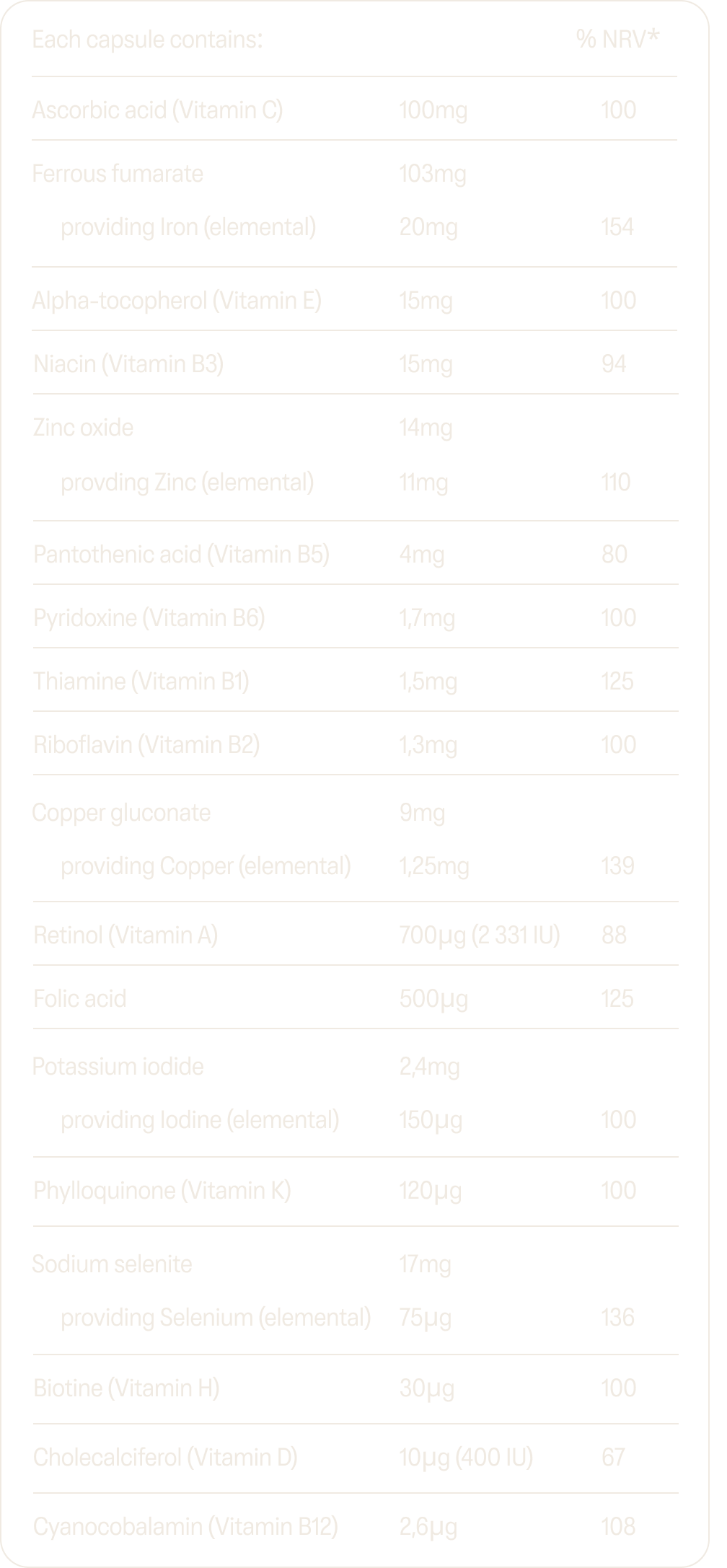- 100% of NRV’s (Nutrient Reference Values) – the recommended intake per day for most vitamins and minerals