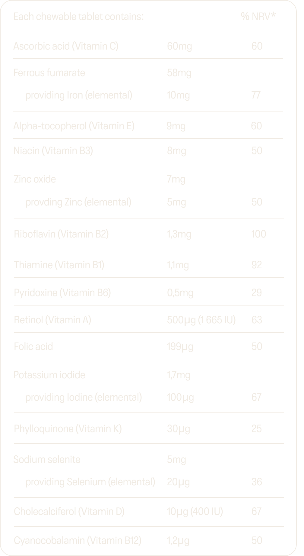 A comprehensive, chewable, orange flavoured multi-micronutrient supplement with 11 essential vitamins and three added minerals including iron.